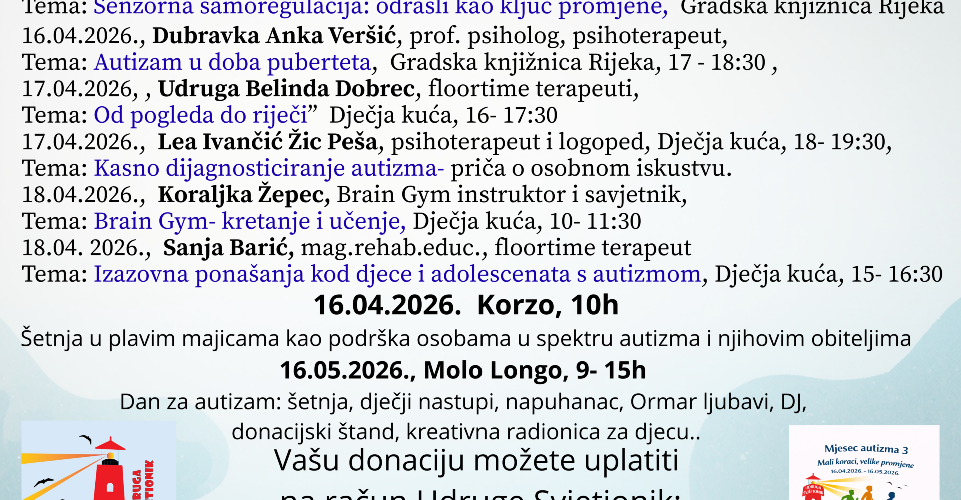 Pozivamo vas da nam se pridružite kroz niz inspirativnih predavanja i događanja posvećenih razumijevanju, podršci i uključivanju osoba u spektru autizma.