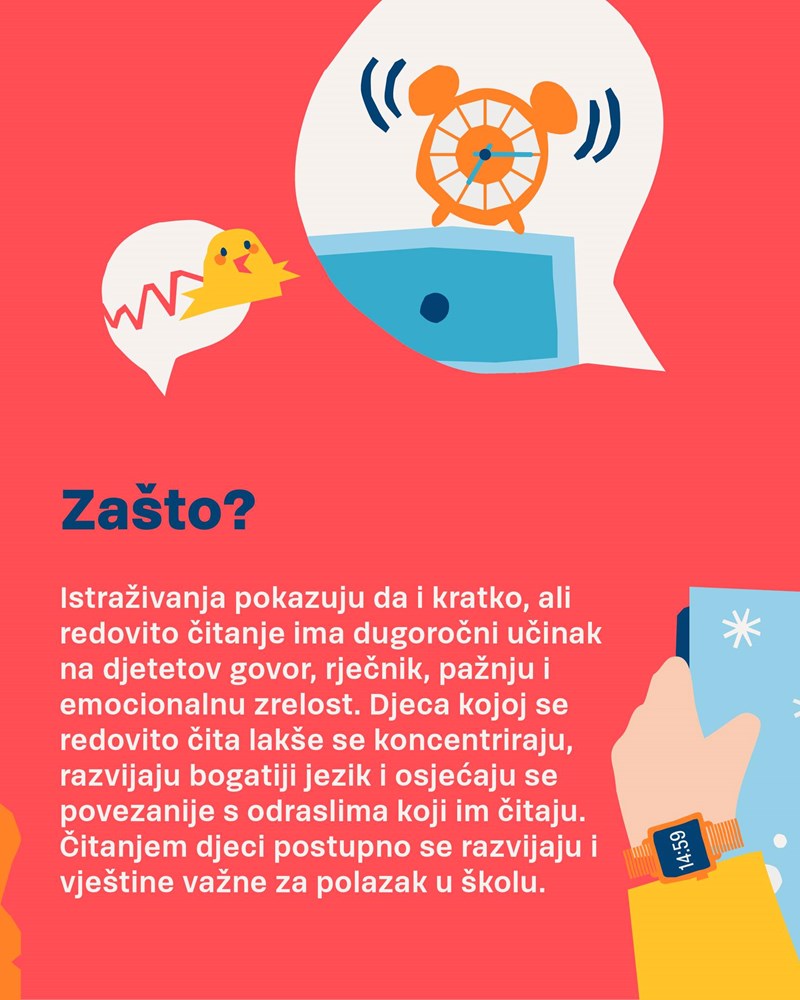 Zašto mini pričaonica? Petnaest minuta dnevno dovoljno je da čitanje postane navika. Djeca koja redovito slušaju priče razvijaju bogatiji rječnik, lakše se koncentriraju i osjećaju se povezanije s odraslima koji im čitaju.