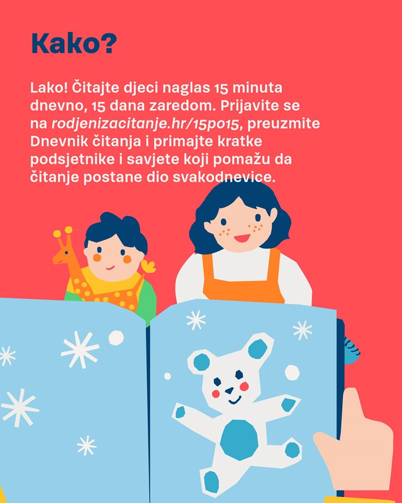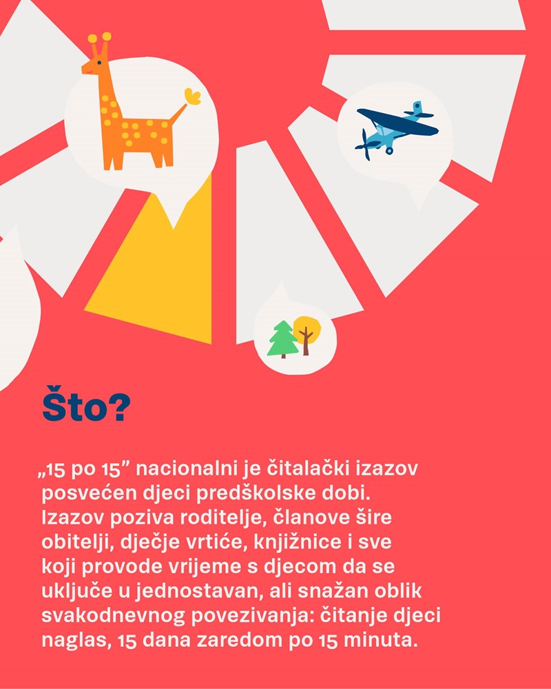 Nacionalni čitalački izazov „15 po 15: cijela Hrvatska čita djeci“ kampanja je koja poziva roditelje, skrbnike, vrtiće, knjižnice i sve odrasle koji se brinu o djeci da 15 dana zaredom čitaju djeci 15 minuta. Izazov započinje 15. siječnja 2026. godine, a cilj mu je potaknuti stvaranje trajne navike zajedničkog čitanja u obiteljima diljem Hrvatske. Izazov „15 po 15“ temelji se na jednostavnoj, ali snažnoj poruci: redovitost i kontinuitet čitanja ključni su za djetetov razvoj. Već 15 dana dosljednog čitanja dovoljno je da se uoče prve pozitivne promjene te da čitanje postane dio svakodnevice.