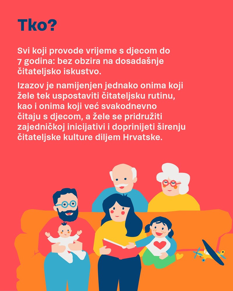 U izazovu mogu sudjelovati roditelji, skrbnici, bake i djedovi, ali i svi drugi koji žele čitati djeci, a prijave su otvorene putem mrežnih stranica. Tijekom trajanja izazova sudionici će svakodnevno primati savjete, preporuke te korisne poveznice i materijale, uz poveznicu na tematske sadržaje programa Rođeni za čitanje, a po završetku imat će priliku podijeliti svoja iskustva.